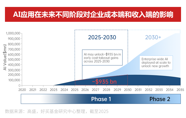 據(jù)高盛測算,2025-2030年,AI或通過降低企業(yè)成本產(chǎn)生近萬億美元的經(jīng)濟效益。2030年之后,更大范圍的AI推廣或解鎖新的企業(yè)價值增長曲線。