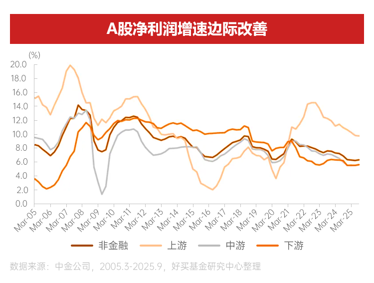 在此政策協(xié)同背景下,企業(yè)盈利已呈現(xiàn)逐步企穩(wěn)態(tài)勢。寬貨幣環(huán)境、財政刺激加力與地方化債進程共同推動萬得全A凈利潤增速見底回升。從結(jié)構(gòu)上看,各行業(yè)盈利增速仍呈現(xiàn)明顯分化現(xiàn)象,其中偏科技領(lǐng)域在財政結(jié)構(gòu)化支持與產(chǎn)業(yè)轉(zhuǎn)型驅(qū)動下表現(xiàn)領(lǐng)先,反映出經(jīng)濟增長動能正在發(fā)生結(jié)構(gòu)性轉(zhuǎn)變。
