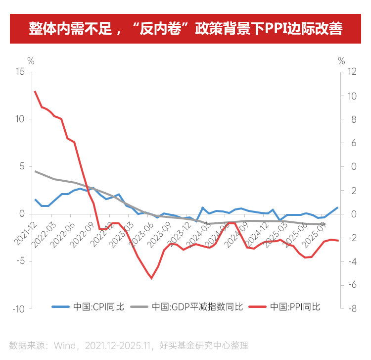 貨幣政策方面,預(yù)計2026年仍將延續(xù)“適度寬松”的基調(diào)?;仡?025年,一季度受政府債集中發(fā)行、匯率波動及資金防空轉(zhuǎn)等因素影響,銀行間流動性整體偏緊;二季度起央行通過降準降息等操作邊際放松貨幣政策,流動性環(huán)境逐步改善。進入下半年,“反內(nèi)卷”政策推升通脹預(yù)期,疊加股債市場資金輪動,帶動長端利率上行。展望2026年,在“擴內(nèi)需”政策導(dǎo)向下,流動性環(huán)境有望保持合理充裕,為實體經(jīng)濟修復(fù)提供支持。