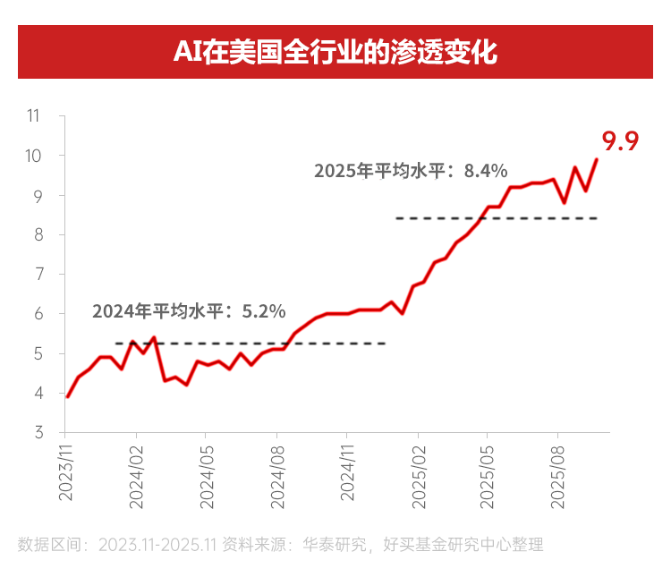 AI帶來的科技產(chǎn)業(yè)長期趨勢性投資機會值得高度關(guān)注,以美國企業(yè)AI滲透率為例,前三次科技革命的成果當前的滲透率都接近100%;而被定義為第四次科技革命的AI ,當前的應(yīng)用滲透率僅10%左右,對比前三次科技革命成果,未來滲透率提升空間巨大。