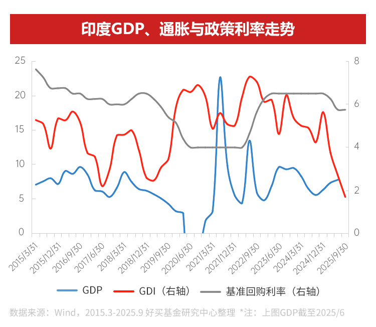 4、印度:印度GDP增速在全球主要經(jīng)濟體中持續(xù)領(lǐng)先,同時,通脹有效控制與央行降息周期的開啟,有望提振消費與投資動能。盡管外資短期受關(guān)稅影響外資有所流出,但其較高的長期經(jīng)濟增長潛力預(yù)計仍將支撐股市未來的超額表現(xiàn)。
