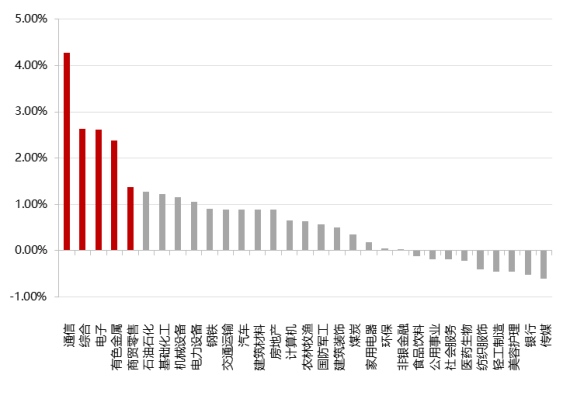 31個申萬一級行業(yè)中有22個行業(yè)上漲。其中,通訊、綜合、電力設(shè)備表現(xiàn)居前,漲跌幅分別為4.28%、2.63%、2.62%,美容護(hù)理、銀行、傳媒表現(xiàn)居后,漲跌幅分別為-0.45%、-0.52%、-0.61%。滬市有1193只個數(shù)上漲,占比53.24%,深市有1631只個數(shù)上漲,占比55.91%。非ST個股中,94只個股漲停,7只個股跌停。股指期貨主力合約漲跌不一,其中,0只期指好于現(xiàn)貨指數(shù)。