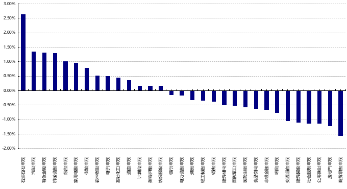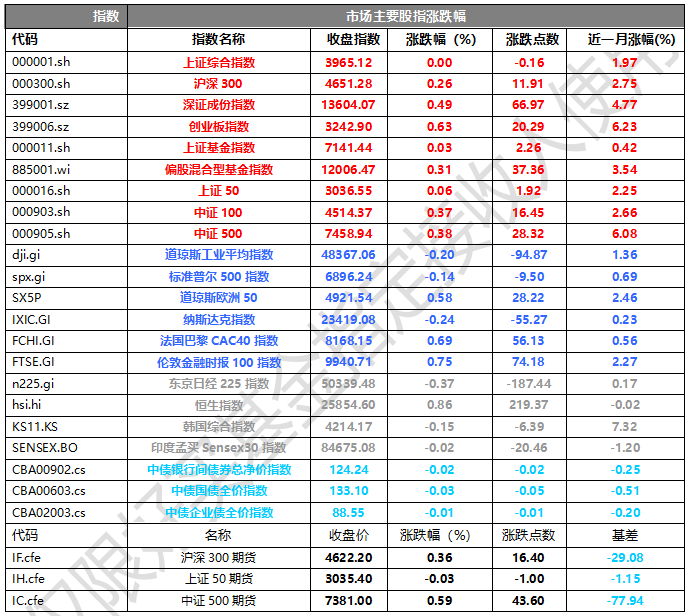 31個申萬一級行業(yè)中有14個行業(yè)上漲。其中,石油石化(申萬)、汽車(申萬)、有色金屬(申萬)表現(xiàn)居前,漲跌幅分別為2.63%、1.35%、1.31%,公用事業(yè)(申萬)、房地產(chǎn)(申萬)、商貿(mào)零售(申萬)表現(xiàn)居后,漲跌幅分別為-1.14%、-1.22%、-1.56%。滬市有746只個數(shù)上漲,占比37.77%,深市有986只個數(shù)上漲,占比35.84%。非ST個股中,60只個股漲停,17只個股跌停。股指期貨主力合約漲跌不一,其中,2只期指好于現(xiàn)貨指數(shù)。
