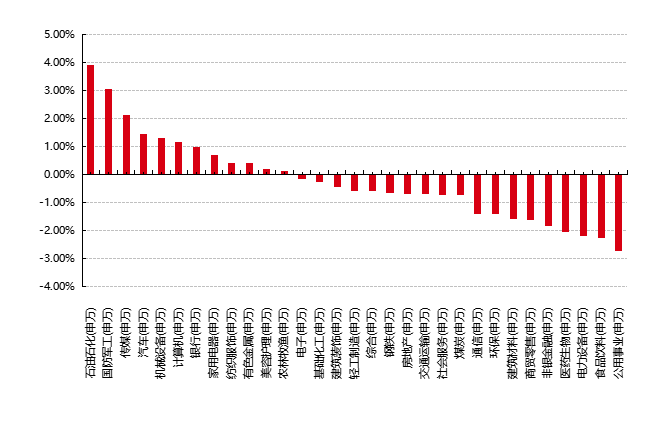 31個(gè)申萬(wàn)一級(jí)行業(yè)中有12個(gè)行業(yè)上漲。其中,石油石化(申萬(wàn))、國(guó)防軍工(申萬(wàn))、傳媒(申萬(wàn))表現(xiàn)居前,漲跌幅分別為3.92%、3.05%、2.13%,電力設(shè)備(申萬(wàn))、食品飲料(申萬(wàn))、公用事業(yè)(申萬(wàn))表現(xiàn)居后,漲跌幅分別為-2.18%、-2.26%、-2.72%。