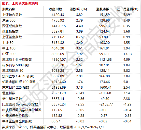 2026年第一周,滬深兩市雙雙收漲。截止收盤,上證綜指收于4120.43點(diǎn),漲151.59點(diǎn),漲幅為3.82%;深成指收于14120.15點(diǎn),漲595.13點(diǎn),漲幅為4.40%;滬深300收于4758.92點(diǎn),漲128.98點(diǎn),漲幅為2.79%;創(chuàng)業(yè)板收于3327.81點(diǎn),漲124.64點(diǎn),漲幅為3.89%。